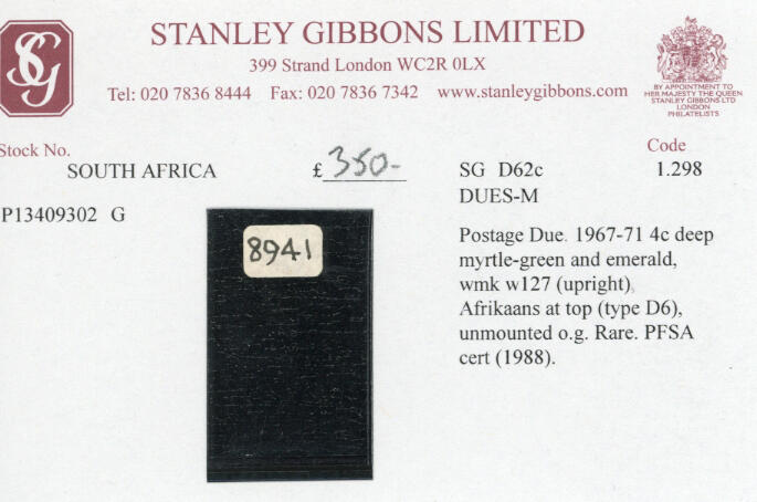 | Zusatzinformationen und Suchstichworte: | 27. Ferrario Auktion 18. Dezember 2022 Los 1346 Südafrika Südafrika Nachgebühr 1967/71 - 4 cent. Tief myrthengrün und smaragd, Wasserzeichen w 127 aufrecht, Typ D6 (S. G. 62C), postfrisch, Originalgummi, Pracht. Prüfbefund von philatelistisch Föderation von Südafrika. Ausruf 100,00 EUR |