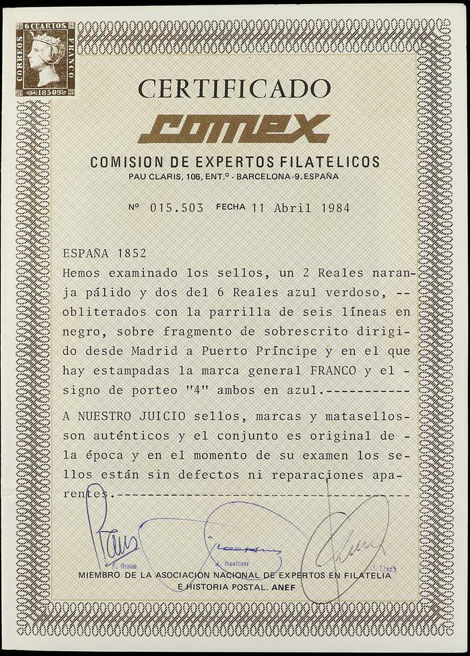| Zusatzinformationen und Suchstichworte: | Soler y Llach - 783. Auktion - Sammlungen und Posten Spanien, ex Kolonien und Weltweit 19. - 20. Dezember 2022 Los 194 Spanien ESPAÑA. 1852. Fragmento de carta de MADRID a PUERTO PRÍNCIPE, franqueado con sellos de 2 reales naranja, 5 reales verde y 6 reales azul, correspondiente a la tarifa para un peso de 13 adarmes. PIEZA EXCEPCIONAL y RARÍSIMA. Cert. COMEX y GRAUS. Ed.14, 15, 16 Ausruf 3.500,00 EUR |