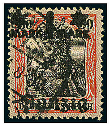 | Zusatzinformationen und Suchstichworte: | Dr. Derichs 7. Online Live Auktion 27. - 28. Dezember 2022 Los 2848 Danzig 1 Mk. auf 30 Pfg., Abart "doppelter Netzunterdruck, beide Spitzen nach unten", Luxusstück mit zeitgerechter Abstempelung. Eine extrem seltene Marke. Fotoattest Gruber BPP: "in einwandfreier Qualität". (Michel 2.000.-) Ausruf 650,00 EUR |