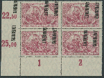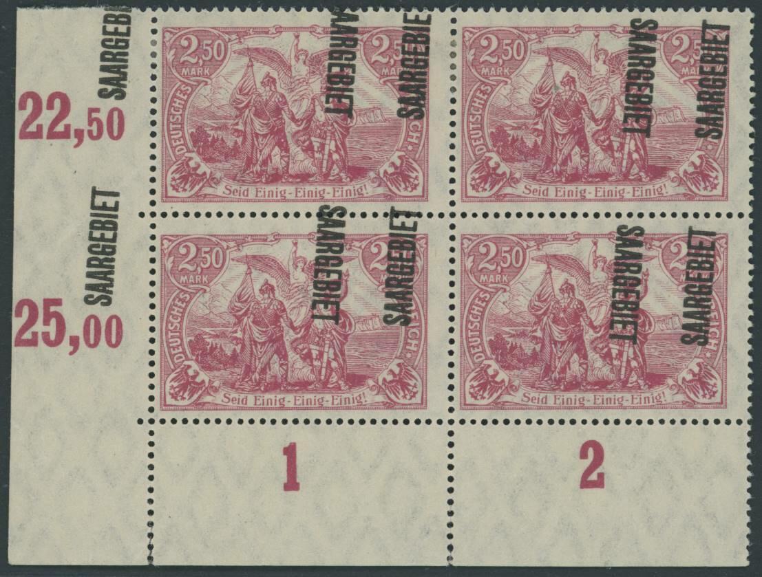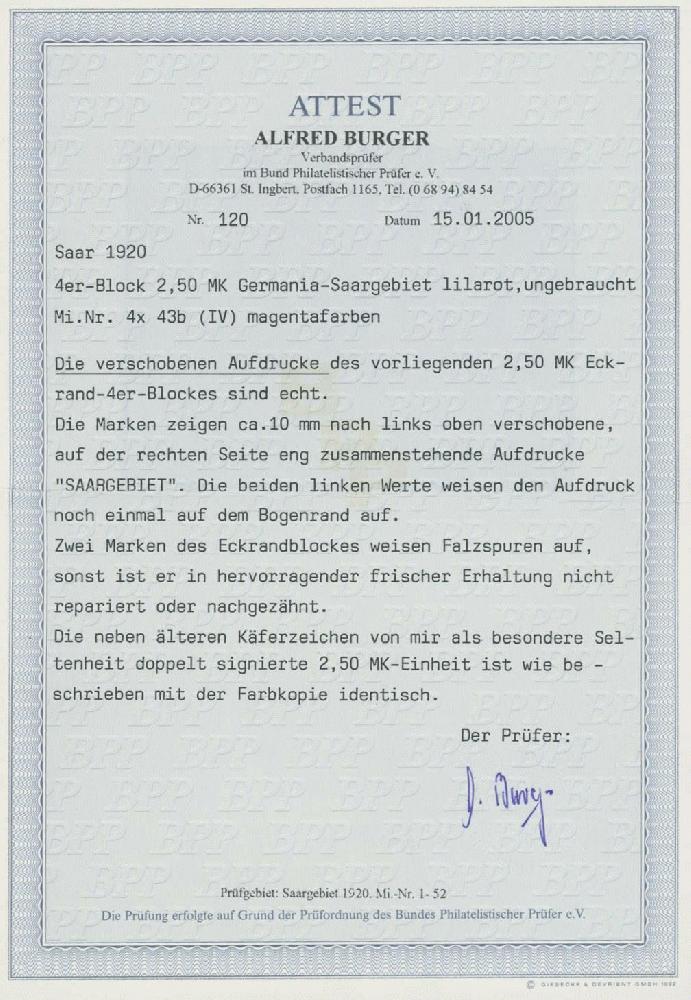 | Zusatzinformationen und Suchstichworte: | Ulrich Felzmann 34. e@uction 5. - 9. September 2022 Los 14450 Saargebiet 2,50 Mk purpurlila im Viererblock mit Eckrand unten links mit seitlich stark verschobenem und schrägem Aufdruck, auch auf den Markenrand übergehend, drei Werte ungebraucht mit Falzspuren bzw leichter Haftspur, ein Wert postfrisch, doppelt signiert und Fotoattest Burger BPP Ausruf 80,00 EUR |