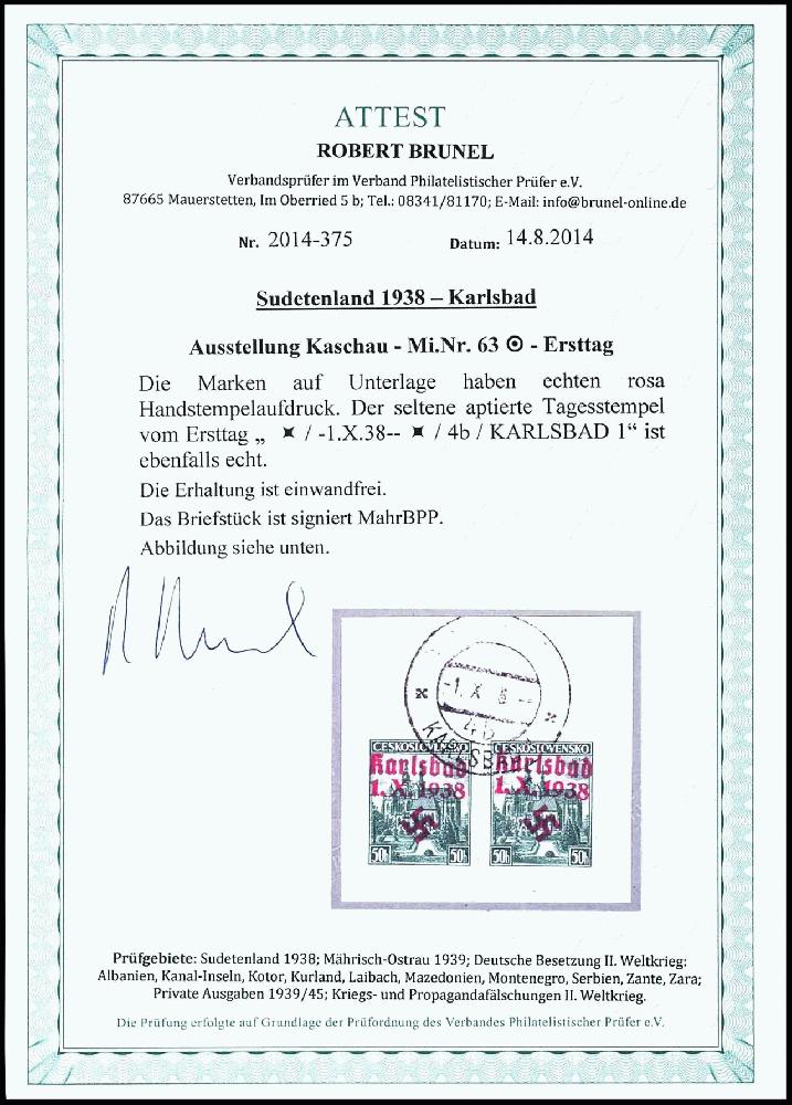 | Zusatzinformationen und Suchstichworte: | Dr. Reinhard Fischer 189. Auktion 24. - 26. November 2022 Los 4015 Sudetenland Karlsbad 50 H. Ausstellung Kaschau,waagerechtes Paar, tadellos gestempelt mit Ersttagsstempel "Karlsbad 1 1.X.38" auf Briefstück, Auflage nur 452 Stück - davon nur wenige mit Ersttagsstempel, Fotoattest Brunel VP: "Die Erhaltung ist einwandfrei.", Mi. 600.- Ausruf 200,00 EUR |