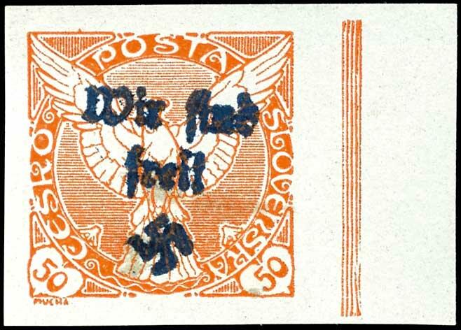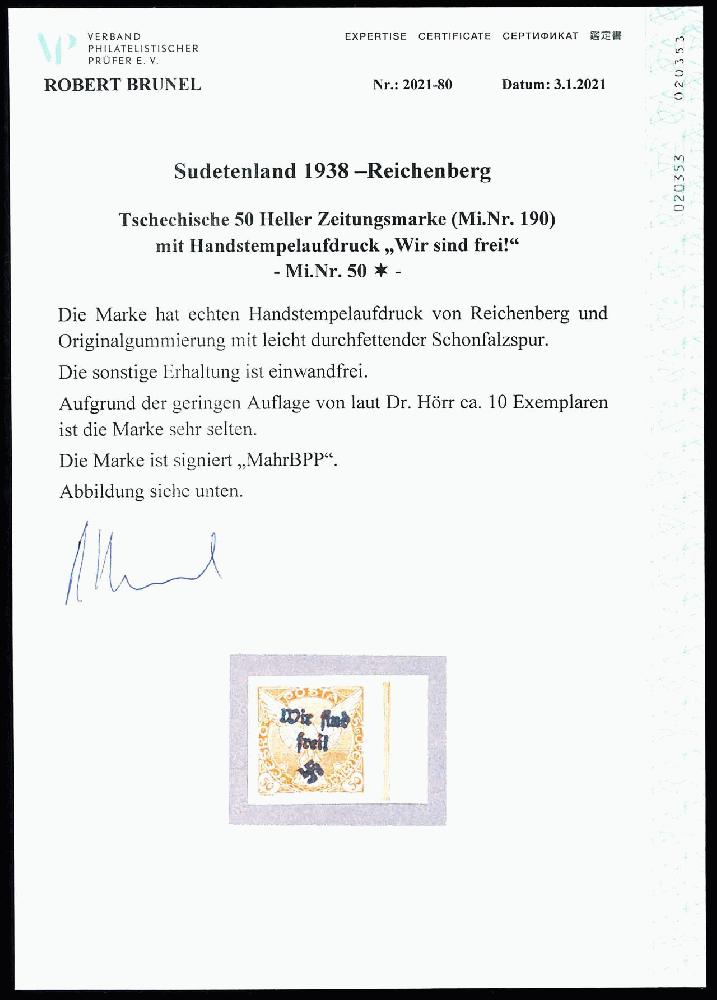 | Zusatzinformationen und Suchstichworte: | Dr. Reinhard Fischer 189. Auktion 24. - 26. November 2022 Los 4017 Sudetenland Reichenberg 50 Heller Zeitungsmarke mit Handstempelaufdruck "Wir sind frei! + Hakenkreuz", ungebraucht mit Originalgummierung, Schonfalzspur sonst tadellos - in Anbetracht der Auflage von nur 10 Exemplaren zu vernachlässigen, Expertise Brunel VP (2021): "Die sonstige Erhaltung ist einwandfrei. Aufgrund der geringen Auflage laut Dr. Hörr von ca. 10 Exemplaren ist die Marke sehr selten.", Mi. 3.500.- Zuschlag 675,00 EUR |