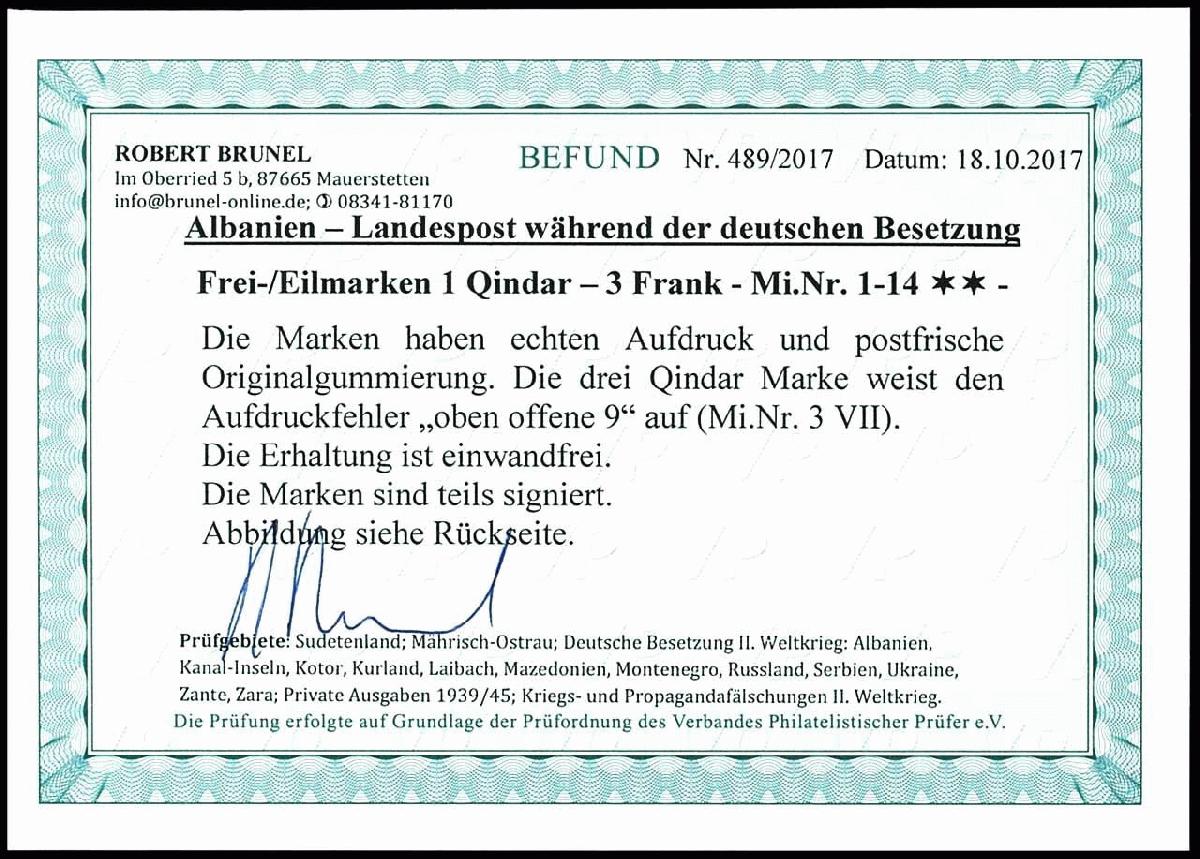 | Zusatzinformationen und Suchstichworte: | Dr. Reinhard Fischer 189. Auktion 24. - 26. November 2022 Los 4027 Deutsche Besetzung II. WK Albanien 1 Q- 3 Fr. postfrisch kpl., teils geprüft Dr. Rommerskirchen BPP, Fotobefund Brunel VP, Mi. 500,- Zuschlag 180,00 EUR |