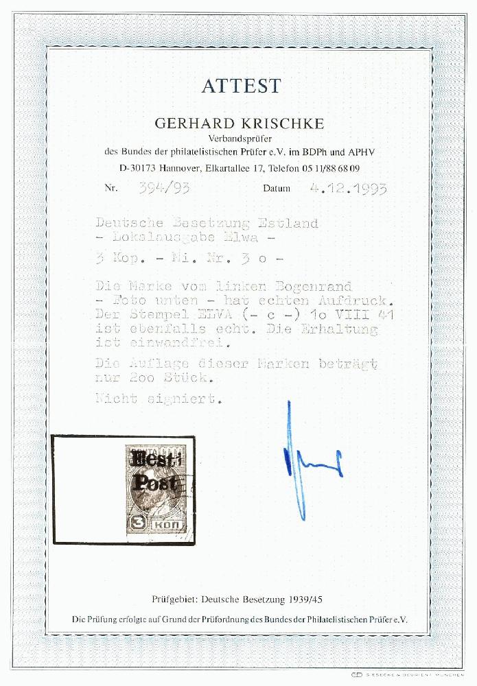 | Zusatzinformationen und Suchstichworte: | Dr. Reinhard Fischer 189. Auktion 24. - 26. November 2022 Los 4054 Deutsche Besetzung II. WK Estland Elwa 3 Kop. hellblau mit Handstempel-Aufdruck "Eesti Post", tadellos gestempelt, Auflage nur 200 Stück, geprüft und Fotoattest Krischke BPP: "echt und einwandfrei", Mi. 650.- Ausruf 250,00 EUR |