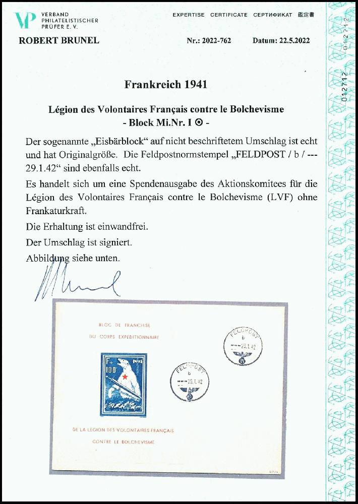 | Zusatzinformationen und Suchstichworte: | Dr. Reinhard Fischer 189. Auktion 24. - 26. November 2022 Los 4057 Deutsche Besetzung II. WK Französische Legion Blockausgabe "Freiwilligen-Legion" sog. Eisbär-Block, auf Blanko-Umschlag mit Feldpostnormstempel "Feldpost b 29.1.42", tadellos, Expertise Brunel VP (2022): "Die Erhaltung ist einwandfrei.", Mi. 800.- Ausruf 250,00 EUR |