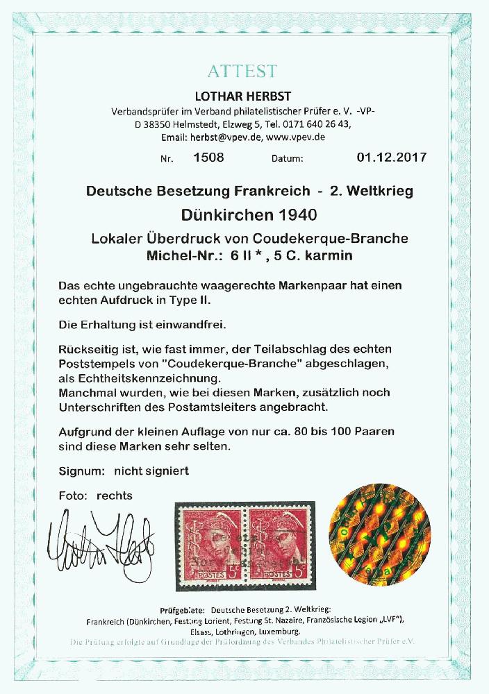 | Zusatzinformationen und Suchstichworte: | Dr. Reinhard Fischer 189. Auktion 24. - 26. November 2022 Los 4073 Deutsche Besetzung II. WK Frankreich Dünkirchen 5 C. Freimarke, waagerechtes Paar mit Aufdruck in Type II, rückseitig wie üblich Teilabschlag des Poststempels "Coudekerque-Branche" als Echtheitskennzeichnung, tadellos ungebraucht, Fotoattest Lothar Herbst VP (2017): "Die Erhaltung ist einwandfrei. Aufgrund der kleinen Auflage von nur ca. 80 - 100 Paaren sind diese Marken sehr selten." Mi. 1.400.- Ausruf 500,00 EUR |