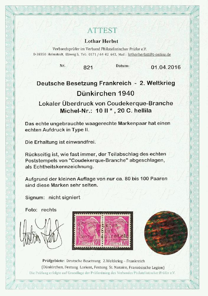 | Zusatzinformationen und Suchstichworte: | Dr. Reinhard Fischer 189. Auktion 24. - 26. November 2022 Los 4074 Deutsche Besetzung II. WK Frankreich Dünkirchen 20 C. Freimarke im waager. Paar mit Aufdruck in Type II, tadellos ungebraucht mit voller Originalgummierung und kleinem Falzrest, rückseitig Teilabschlag des echten Poststempels von "Coudekerque-Branche" als Echtheitsbestätigung, unsigniert, Fotoattest Lothar Herbst VP (2016): "Die Erhaltung ist einwandfrei. Aufgrund der sehr kleinen Auflage von nur ca. 80 bis 100 Paaren sind diese Marken sehr selten." Ausruf 500,00 EUR |