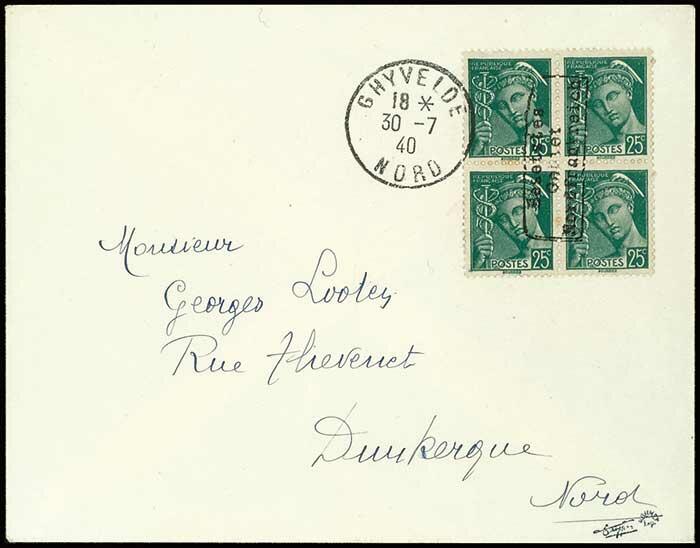 | Zusatzinformationen und Suchstichworte: | Dr. Reinhard Fischer 189. Auktion 24. - 26. November 2022 Los 4075 Deutsche Besetzung II. WK Frankreich Dünkirchen 25 C. Freimarke mit Aufdruck in Type I, Viererblock mit einem senkrechten Aufdruck als portogerechte Frankatur auf Brief von "Ghyvelde 30.7.40" nach Dunkerque Nord mit Ank.-Stempel vom 31.7.40, tadellos, Auflage ca. 500 Paare, Fotoattest Tust BPP, Mi. 1.700.- Ausruf 500,00 EUR |