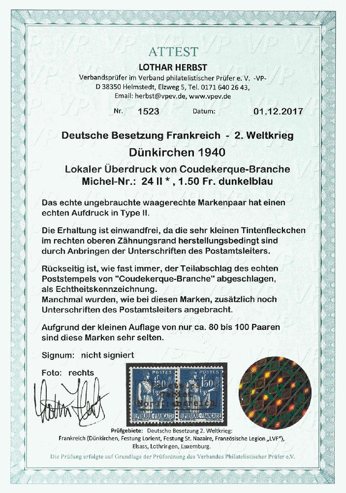 | Zusatzinformationen und Suchstichworte: | Dr. Reinhard Fischer 189. Auktion 24. - 26. November 2022 Los 4077 Deutsche Besetzung II. WK Frankreich Dünkirchen 1,50 Fr. Freimarke dunkelblau im waagerechtem Paar mit Aufdruck in Type II, tadellos ungebraucht mit voller Originalgummierung und kleinem Falzrest, rückseitig Teilabschlag des echten Poststempels von "Coudekerque-Branche" und Unterschrift des Postamtleiters als Echtheitsbestätigung, unsigniert, Fotoattest Lothar Herbst VP (2017): "Die Erhaltung ist einwandfrei. Aufgrund der kleinen Auflage von nur ca. 80 bis 100 Paaren sind diese Marken sehr selten." Mi. 1.400.- Ausruf 500,00 EUR |