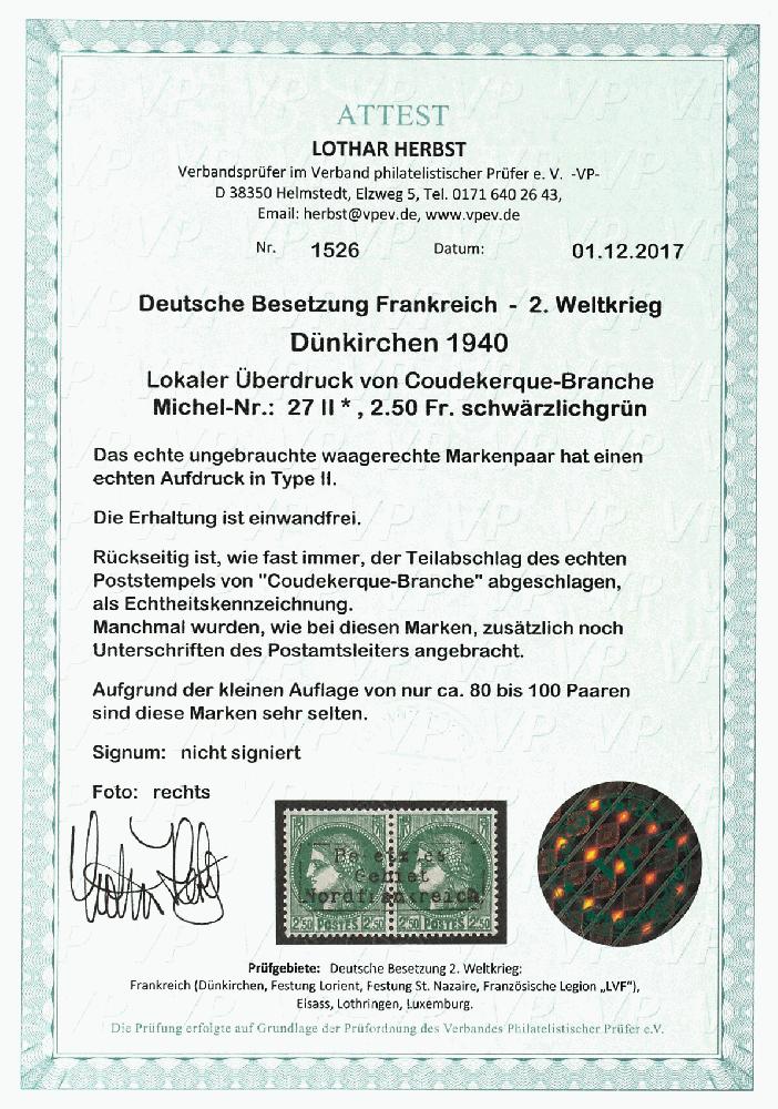 | Zusatzinformationen und Suchstichworte: | Dr. Reinhard Fischer 189. Auktion 24. - 26. November 2022 Los 4078 Deutsche Besetzung II. WK Frankreich Dünkirchen 2,50 Fr. Freimarke schwärzlichgrün im waagerechtem Paar mit Aufdruck in Type II, tadellos ungebraucht mit voller Originalgummierung und kleinem Falzrest, rückseitig Teilabschlag des echten Poststempels von "Coudekerque-Branche" und Unterschrift des Postamtsleiters als Echtheitsbestätigung, unsigniert, Fotoattest Lothar Herbst VP (2017): "Die Erhaltung ist einwandfrei. Aufgrund der kleinen Auflage von nur ca. 80 bis 100 Paaren sind diese Marken sehr selten." Ausruf 600,00 EUR |