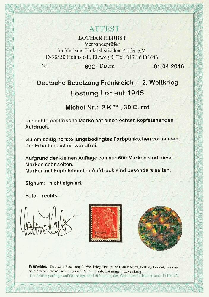 | Prüfgebiet: | Deutsche Besetzung WK 2 Frankreich Lorient |