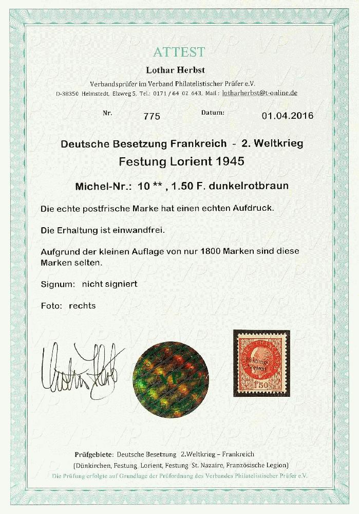 | Zusatzinformationen und Suchstichworte: | Dr. Reinhard Fischer 189. Auktion 24. - 26. November 2022 Los 4086 Deutsche Besetzung II. WK Frankreich Lorient 1,50 Fr. Freimarke braun mit Aufdruck "Festung Lorient", tadellos postfrisch und ohne jegliche Signaturen, Auflage nur 1.800 Stück, Fotoattest Lothar Herbst VP (2016): "Die Erhaltung ist einwandfrei." Mi. 600,- Ausruf 200,00 EUR |