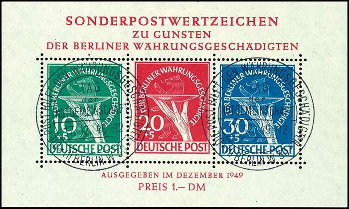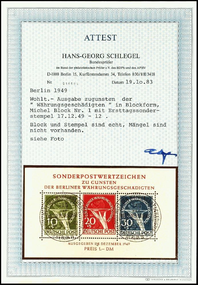 | Zusatzinformationen und Suchstichworte: | Dr. Reinhard Fischer 189. Auktion 24. - 26. November 2022 Los 5775 Berlin Blockausgabe "Für Berliner Währungsgeschädigte", entwertet mit Ersttags-Sonderstempel "BERLIN W30 17.12.49", tadellose Erhaltung, Fotoattest H.-D. Schlegel BPP: "Die Erhaltung ist einwandfrei.", Mi. 2.200.- Ausruf 600,00 EUR |