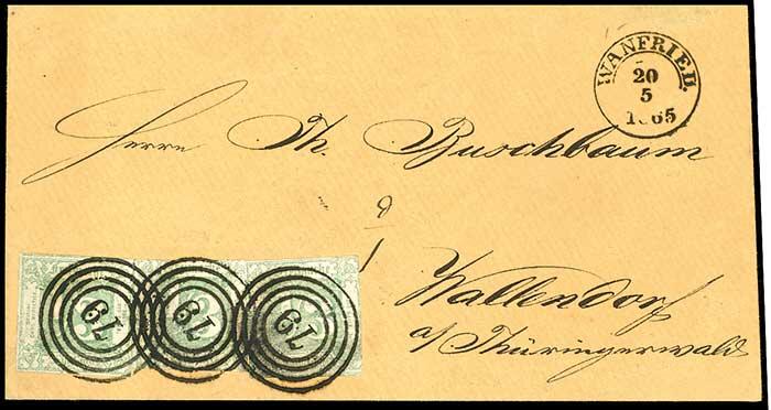 | Zusatzinformationen und Suchstichworte: | Dr. Reinhard Fischer 189. Auktion 24. - 26. November 2022 Los 1862 Altdeutschland Thurn und Taxis 1/3 Sgr. grün, Stück mit Taxisschnitt als Streifen geklebt mit Nummernstempel "79" auf gelbem Firmen-Briefumschlag mit nebengesetztem Dkr. "WANFRIED 20.5.1865" nach Wallendorf, schöner Brief, Fotoattest Dr. Sommer BPP Zuschlag 320,00 EUR |