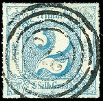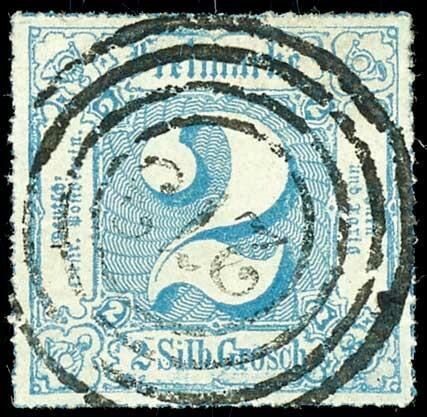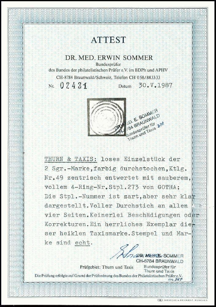 | Zusatzinformationen und Suchstichworte: | Dr. Reinhard Fischer 189. Auktion 24. - 26. November 2022 Los 1864 Altdeutschland Thurn und Taxis 2 Sgr. blau, voller Durchstich an allen vier Seiten, mit zartem Nummernstempel "273" Gotha, tadelloses Stück dieser schwierigen Marke, Fotoattest Sommer BPP, Mi. 700,- Zuschlag 150,00 EUR |