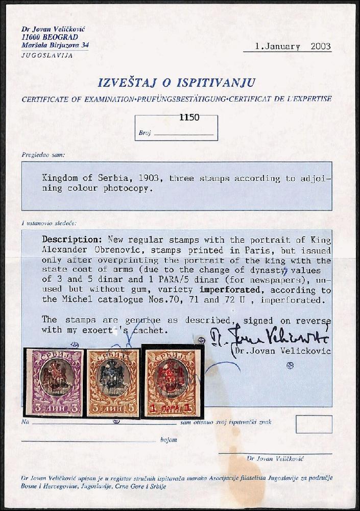 | Zusatzinformationen und Suchstichworte: | 55. SFK Auktion 22. - 23. Oktober 2022 Los 209 Serbien 1903. Novinska marka 5 d sa crvenim pretiskom "1 para" NEZUPČANA, POZNATO SVEGA NEKOLIKO PRIMERAKA, odličan kvalitet. Foto atest Veličković. 1903 Newspaper stamp 5 d with red overprint " 1 para" IMPERFORATED, ONLY A FEW KNOWN, Very fine. Photo certificate Velickovic Zuschlag 130,00 EUR |