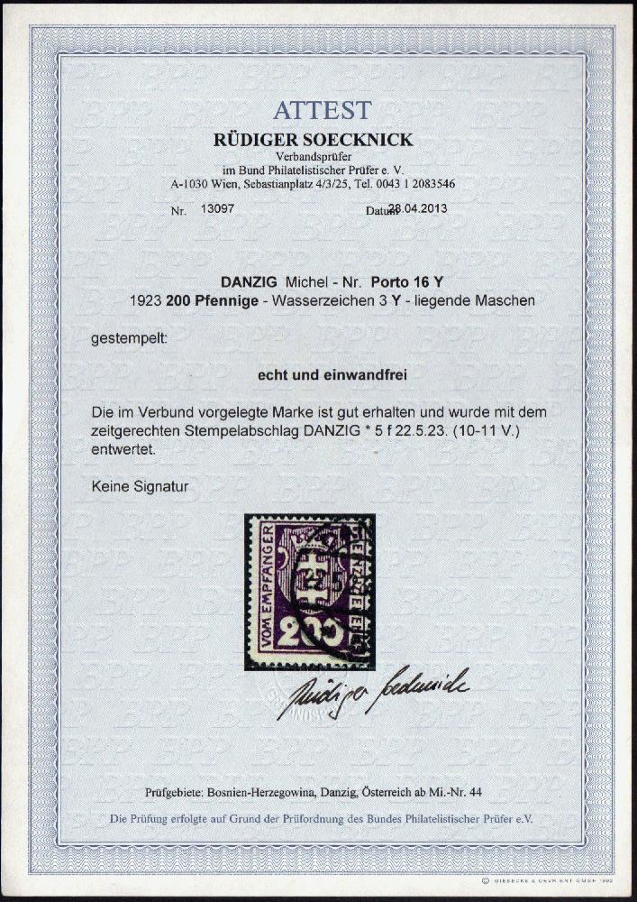 | Zusatzinformationen und Suchstichworte: | 109. Briefmarken Lenz Auktion 31. Oktober - 3. November 2022 Los 5708 Danzig 1923, 200 Pf. Portomarke, zeitgerecht gestempelt, Echt und Einwandfrei, Attest Soecknick, Mi.1.600,- Ausruf 450,00 EUR |