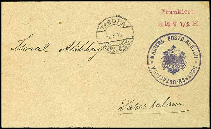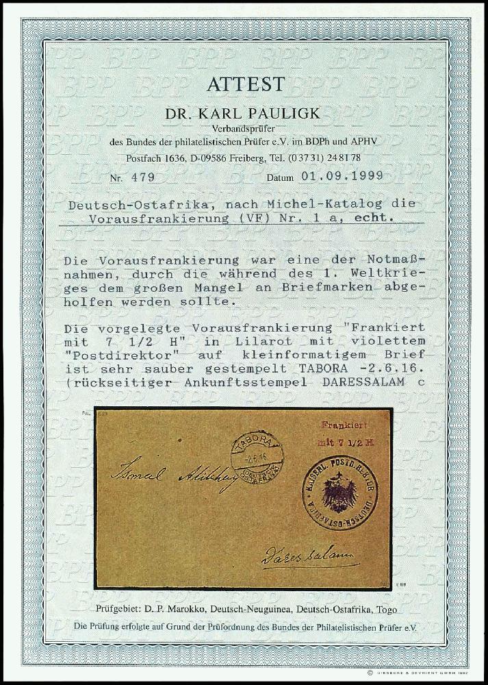 | Zusatzinformationen und Suchstichworte: | Dr. Reinhard Fischer 189. Auktion 24. - 26. November 2022 Los 1912 Deutsche Kolonien Ostafrika Brief mit Vorausfrankatur 7 1/2 H. lilarot, violetten "Postdirektor" auf Brief von "TABORA 2.6.16" nach Darussalam mit Ankunftsstempel, Umschlag rechts minimal verkürzt, Fotoattest Pauligk Ausruf 200,00 EUR |