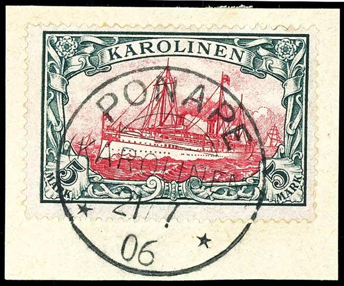 | Zusatzinformationen und Suchstichworte: | Dr. Reinhard Fischer 189. Auktion 24. - 26. November 2022 Los 1921 Deutsche Kolonien Karolinen 5 M. Kaiseryacht, gestempelt "PONAPE 21.7.06" auf Briefstück, kabinett, Fotoattest Steuer BPP, Mi. 600,- Ausruf 200,00 EUR |