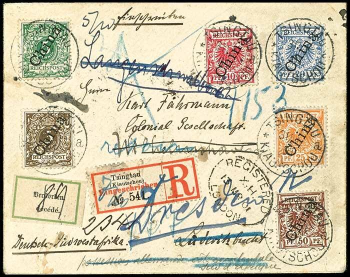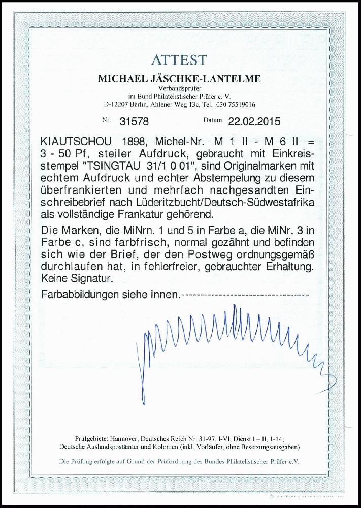| Zusatzinformationen und Suchstichworte: | Dr. Reinhard Fischer 189. Auktion 24. - 26. November 2022 Los 1922 Deutsche Kolonien Kiautschou, Vorläufer Deutsche Post China 3 - 50 Pfg. mit steilem Aufdruck, dabei 10 Pfg. dunkelrosarot, gestempelt "TSINGTAU 31.1.01" auf mehrfach nachgesandten R-Brief nach Lüderitzbucht/DSWA, Fotoattest Jäschke-L. BPP Zuschlag 340,00 EUR |