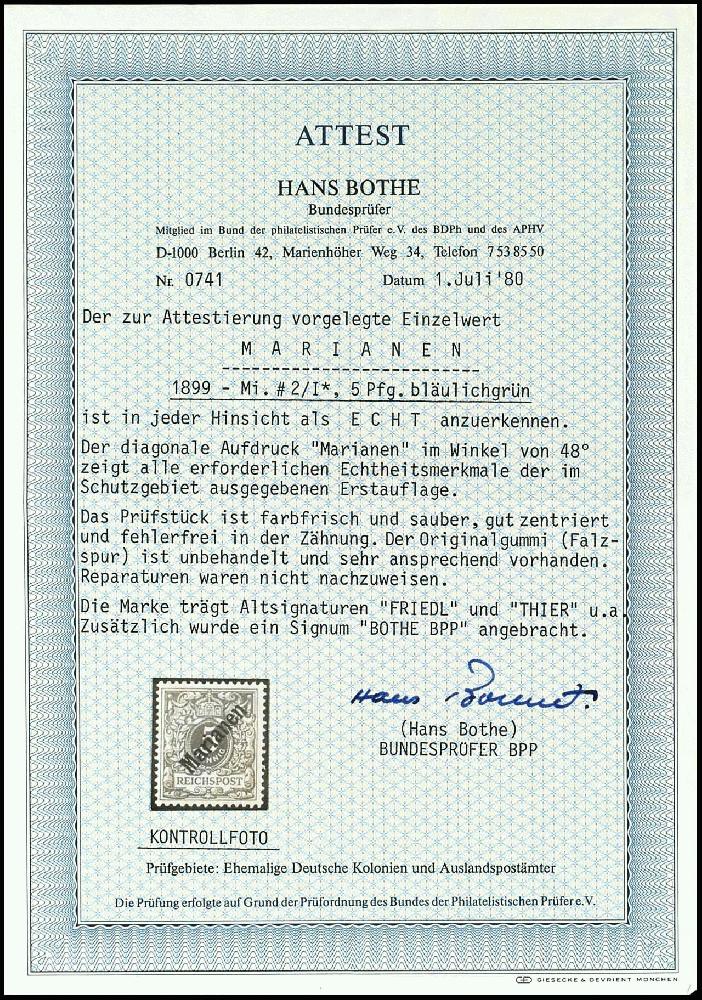| Zusatzinformationen und Suchstichworte: | Dr. Reinhard Fischer 189. Auktion 24. - 26. November 2022 Los 1928 Deutsche Kolonien Marianen 5 Pfg. mit diagonalem Aufdruck, ungebraucht, tadellos, u.a. geprüft Bothe BPP mit Fotoattest, Mi. 3000,- Ausruf 800,00 EUR |