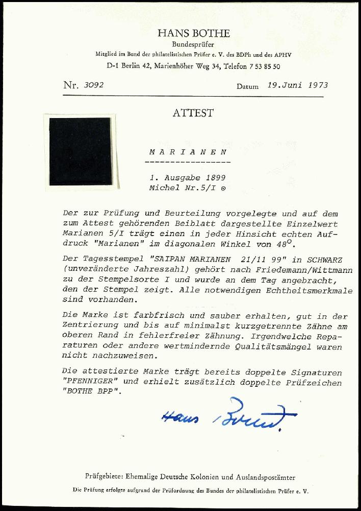 | Zusatzinformationen und Suchstichworte: | Dr. Reinhard Fischer 189. Auktion 24. - 26. November 2022 Los 1930 Deutsche Kolonien Marianen 25 Pfg. mit diagonalem Aufdruck, gestempelt "SAIPAN 21.11.99", oben minimalst kurze Zähne, sonst tadellos, Fotoattest Bothe BPP, Mi. 3200,- Zuschlag 800,00 EUR |