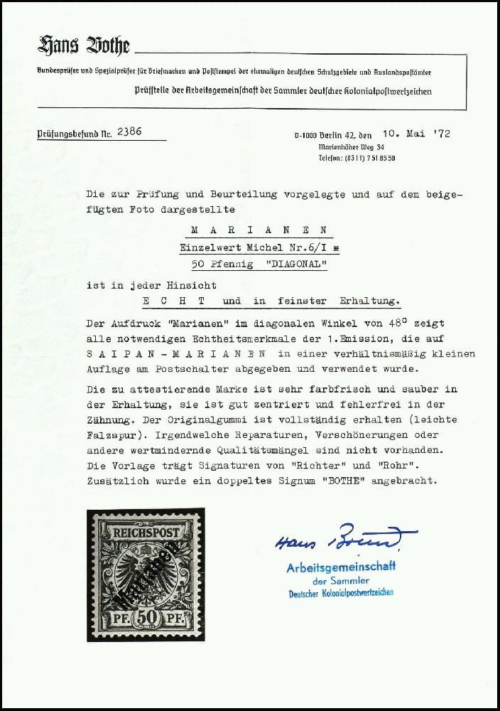 | Zusatzinformationen und Suchstichworte: | Dr. Reinhard Fischer 189. Auktion 24. - 26. November 2022 Los 1930 Deutsche Kolonien Marianen 50 Pfg. mit diagonalem Aufdruck, ungebraucht, u.a. geprüft Bothe BPP mit Fotoattest, Mi. 3200,- Ausruf 800,00 EUR |