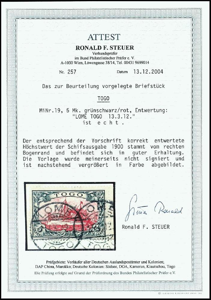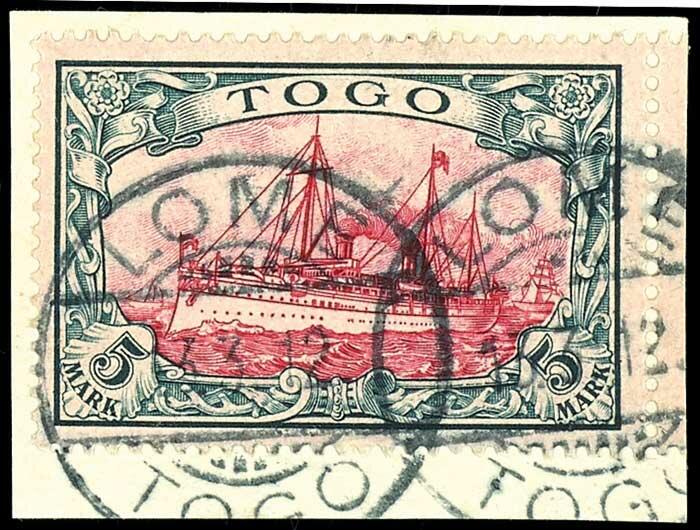 | Zusatzinformationen und Suchstichworte: | Dr. Reinhard Fischer 189. Auktion 24. - 26. November 2022 Los 1945 Deutsche Kolonien Togo 5 M. Kaiseryacht, gestempelt "LOME 13.3.12" auf Briefstück, tadellos, Fotoattest Steuer BPP, Mi. 600,- Zuschlag 180,00 EUR |