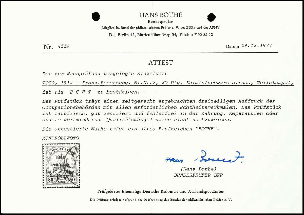 | Prüfgebiet: | Deutsche Kolonien Togo Französische Besetzung |