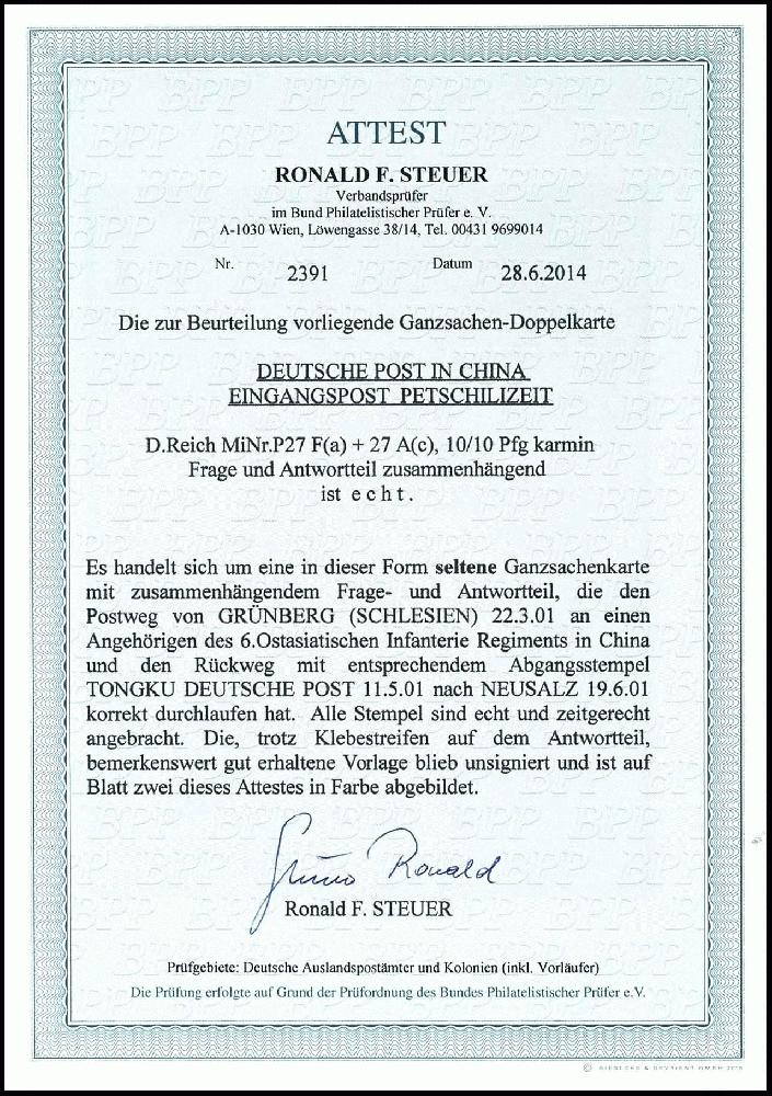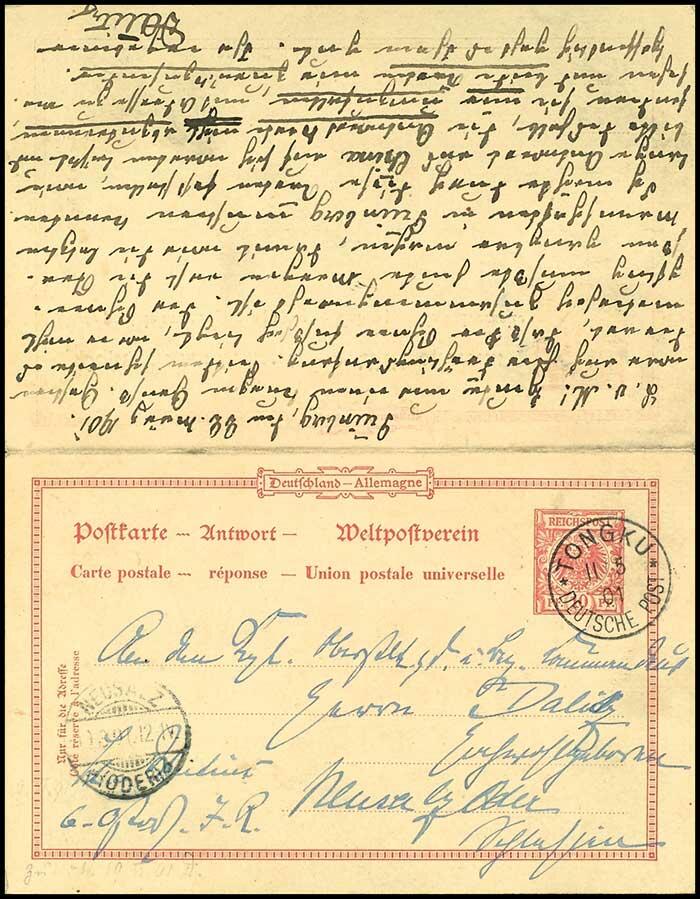 | Zusatzinformationen und Suchstichworte: | Dr. Reinhard Fischer 189. Auktion 24. - 26. November 2022 Los 3089 Deutsche Auslandspost China Eingangspost zur Petschilizeit: bedarfsgebrauchte Ganzsache 10 Pfg Krone/Adler (Antwort und Frageteil zusammenhängend), von Grünberg an einen Angehörigen des 6 Ostasiatischen Infanterie Regiments in China versendet, die Rücksendung erfolgte mit entsprechendem Abgangsstempel "Tongku Deutsche Post 11.5.01" nach Neusatz mit Ankunft 19.6.01, Klebestreifen auf dem Antwortteil der Ordnung halber erwähnt, gute Erhaltung, sehr rares Posstück, Fotoattest Steuer BPP (2014) Ausruf 1.000,00 EUR |