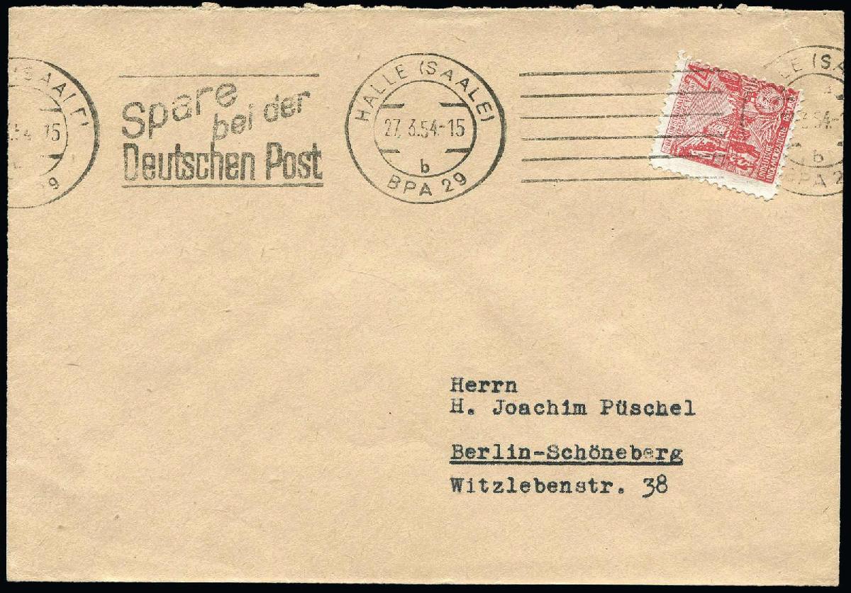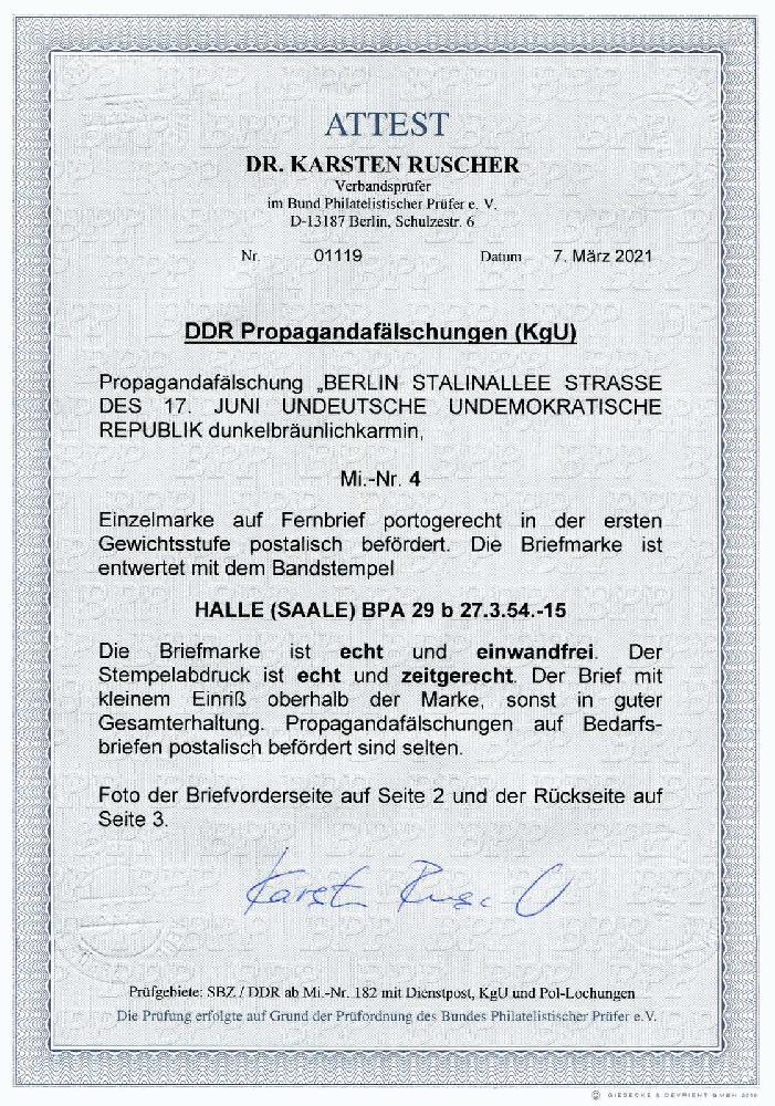 | Zusatzinformationen und Suchstichworte: | 31. Schlegel Auktionshaus Auktion 14. - 18. November 2022 Los 67 DDR Propaganda "1954, 24 Pfg. Propagandafälschung der Michel-Nr. 414 als portogerechte Einzelfrankatur auf Fernbrief von "HALLE (SAALE) BPA 29 b / 27.3.54.-15" nach Berlin-Schöneberg, schöne und vor allem seltene bedarfsmäßige Verwendung, keine weiteren, störenden Werte, die Qualität der Marke ist einwandfrei, der Brief in guter Gesamtqualität mit kleinem Einriss oben rechts, keine Signaturen mit Fotoattest Dr. Ruscher BPP 03/2021" Zuschlag 820,00 EUR |