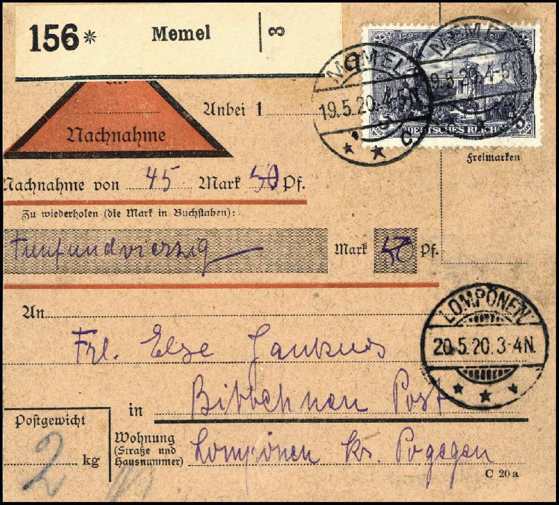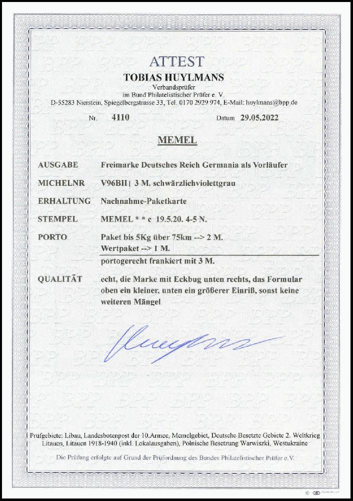 | Zusatzinformationen und Suchstichworte: | Württembergisches Auktionshaus 141. Versteigerung 9. - 10. Dezember 2022 Los 7267 Memel Germania 3 Mk. auf Nachnahme-Paketkarte mit klarem Stempel MEMEL "c" 19.5.20 (leichte Beförd.-Spuren), Fotoattest Huylmans BPP. Katalogpreis: 1.000,- Ausruf 300,00 EUR |