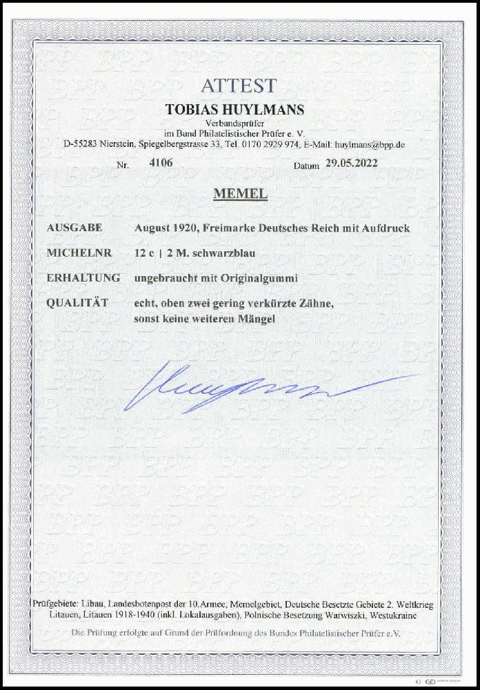 | Zusatzinformationen und Suchstichworte: | Württembergisches Auktionshaus 141. Versteigerung 9. - 10. Dezember 2022 Los 7272 Memel 2 Mk., ungebraucht (zwei min. verkürzte Zähne), Fotoattest Huylmans BPP. Katalogpreis: 250,- Ausruf 100,00 EUR |