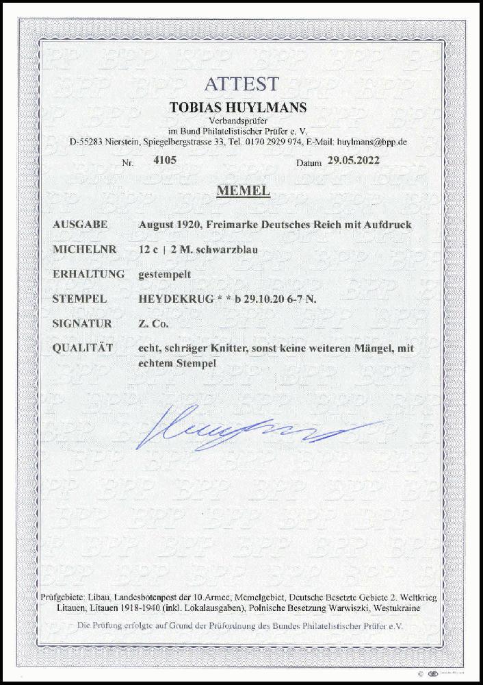 | Zusatzinformationen und Suchstichworte: | Württembergisches Auktionshaus 141. Versteigerung 9. - 10. Dezember 2022 Los 7273 Memel 2 Mk. schwärzlichblau, gestplt. (schräger Knitter), Fotoattest Huylmans BPP. Katalogpreis: 700,- Ausruf 200,00 EUR |