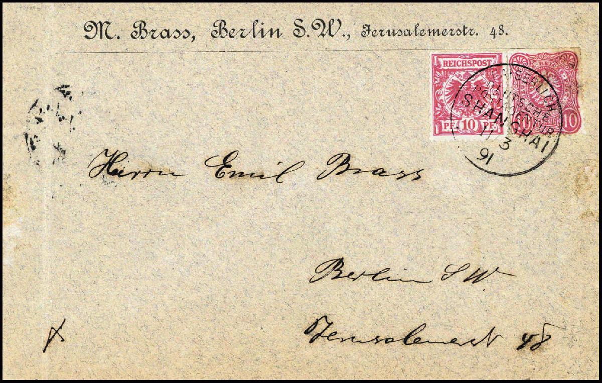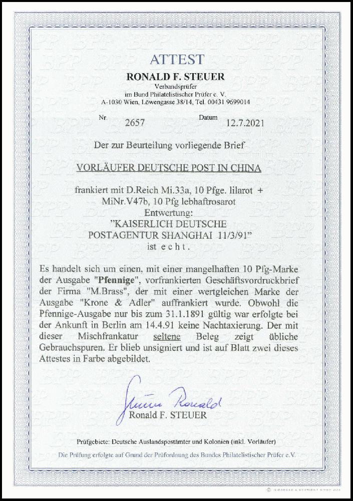| Zusatzinformationen und Suchstichworte: | Württembergisches Auktionshaus 141. Versteigerung 9. - 10. Dezember 2022 Los 4511 Deutsche Auslandspost China, Vorläufer Vorläufer-Mischfrankatur mit Ausgabe "Pfennige": 10 Pfge. lilarot in Mischfrankatur mit Krone/Adler 10 Pfg. lebhaftrosarot als tarifmäßig frankierte 20-Pfg.-Frankatur auf Firmen-Vordruckbrief nach Berlin (übliche leichte Gebrauchsspuren). Klarer Stempel KDPA SHANGHAI 11/3 91. Obwohl die Pfennige-Ausgabe des Deutschen Reiches nur bis zum 31.1.1891 gültig war, erfolgte weder bei der D.P.China noch bei der Ankunft in Berlin am 14.4.1891 eine Nachtaxierung, vermutlich weil der Unterschied zwischen der Pfennige- und Pfennig-Ausgabe sehr gering ist. Nach unseren Unterlagen ist ledigl. ein weiterer Brief mit einer Marke der Ausgabe "Pfennige" in Shanghai verwendet bekannt. Eine spektakuläre Vorläufer-Rarität, Fotoattest Steuer BPP. Ausruf 2.500,00 EUR |