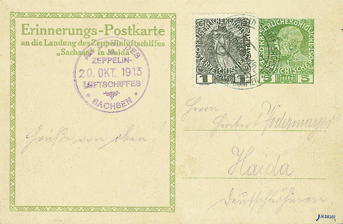 | Zusatzinformationen und Suchstichworte: | Dr. Derichs 7. Online Live Auktion 27. - 28. Dezember 2022 Los 2045 Österreich Luftschiff "Sachsen", Österreichische Post, Erinnerungs-Ganzsachenkarte mit Zusatzfrankatur nach Haida mit Sonderstempel in Type "I" als Entwerter und beigesetztem violetten Bordstempel vom 20.10.1913. Signiert Sieger. Ausruf 300,00 EUR |