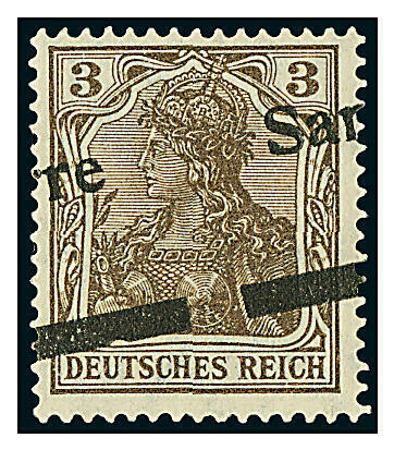 | Zusatzinformationen und Suchstichworte: | Dr. Derichs 7. Online Live Auktion 27. - 28. Dezember 2022 Los 2807 Saar 3 Pfg. "Germania Sarre", Abart "Aufdruck diagonal (statt waagerecht)", postfrisches Luxusstück. Fotoattest Braun BPP: "Die Qualität ist einwandfrei.". (Michel 900.-) Ausruf 100,00 EUR |