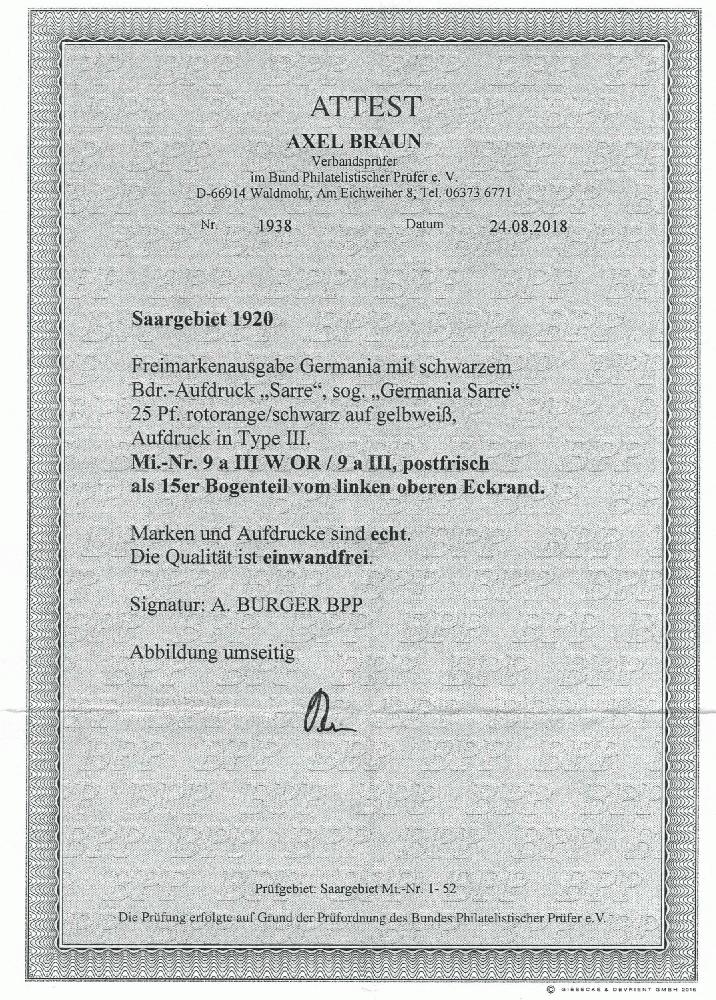 | Prüfgebiet: | Saargebiet (Mi-Nr. 1 - 205) |