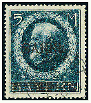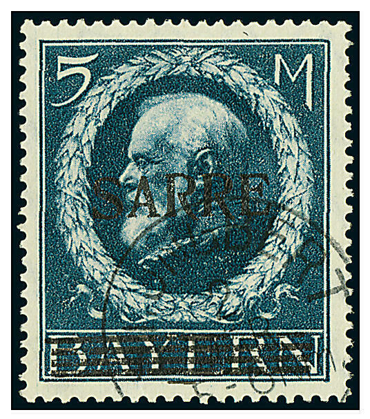 | Zusatzinformationen und Suchstichworte: | Dr. Derichs 7. Online Live Auktion 27. - 28. Dezember 2022 Los 2823 Saar 5 Mk. "Bayern-Sarre", Aufdruckabart "obere Gitterlinie nach links verschoben" (Bogenfeld 10 nur bei einer Teilauflage), Luxusstück mit K1 "St. Ingbert 2.Mär.20". Die Auflage dieser Marke beträgt nur 12.000 Stück = 600 Bogen. Da diese Abart nur einmal im Bogen und nur bei einer Teilauflage vorkommt, kann es nur deutlich weniger als 600 Stück davon geben. Ein Teil dieser höchst seltenen Marken ist im II. Weltkrieg verbrannt und ein weiterer Teil liegt heute postfrisch oder ungebraucht vor, sodaß das vorliegende Stück für eine gestempelt geführte Sammlung eine große Saar-Rarität darstellt. Fotoattest Braun BPP: "Die Qualität ist einwandfrei.". (Michel 3.500.-+) Ausruf 600,00 EUR |