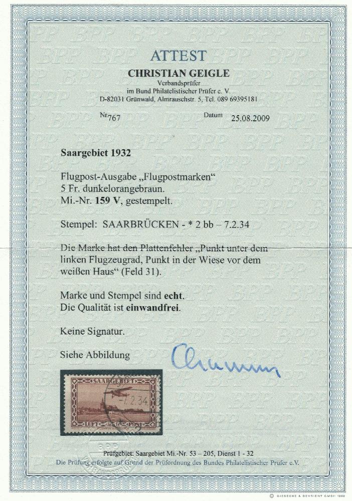 | Prüfgebiet: | Saargebiet (Mi-Nr. 1 - 205) |