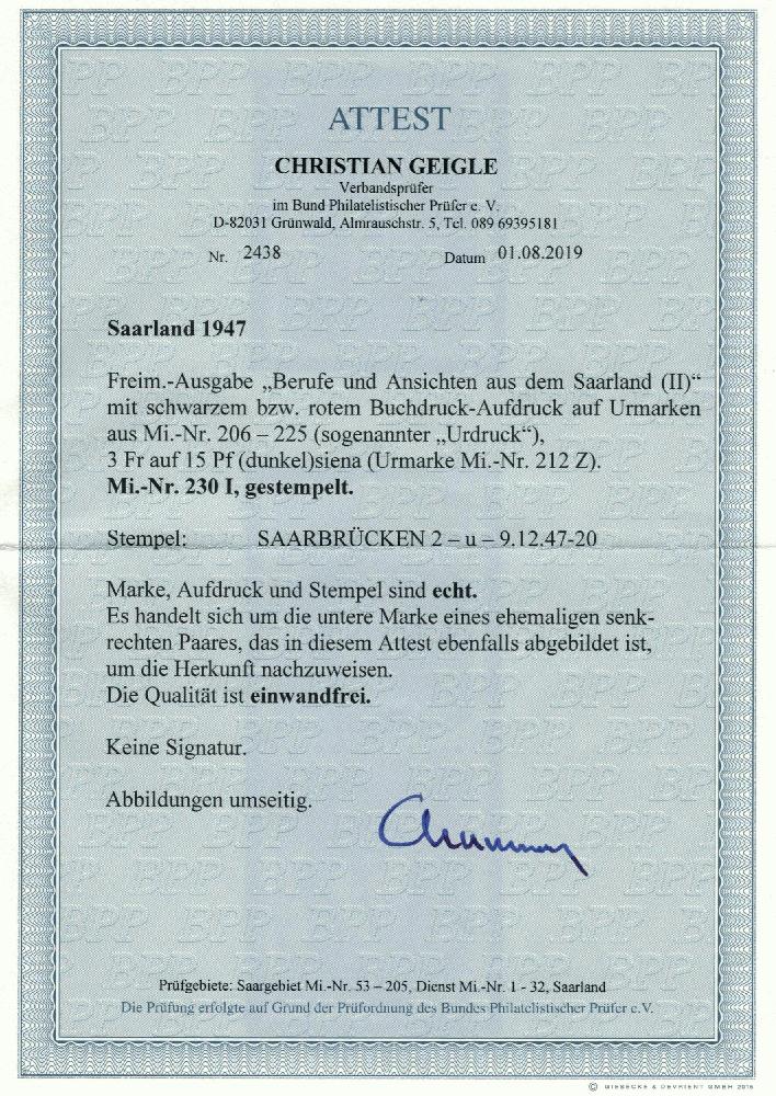 | Prüfgebiet: | Saarland (ab Mi-Nr. 206) |