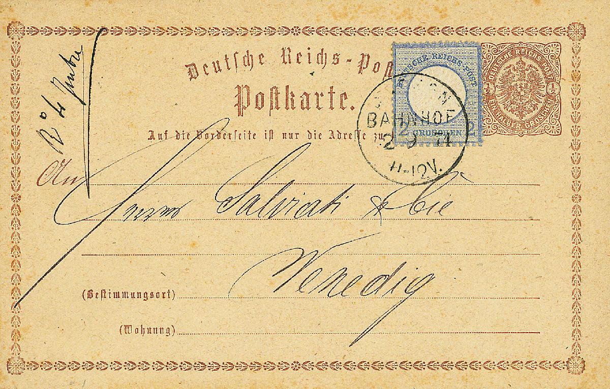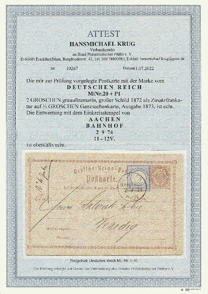 | Zusatzinformationen und Suchstichworte: | Dr. Derichs 7. Online Live Auktion 27. - 28. Dezember 2022 Los 2542 Deutsches Reich, 1872 Grosser Brustschild \POSTKARTE NACH ITALIEN\: 2 Gr. ultramarin, rechts oben minimal eckrund, als Zusatzfrankatur auf Luxus-Ganzsachenkarte 1/2 Gr. braun mit K1 "Aachen Bahnhof 2.9.74" nach Venedig/Italien. Die Gebühr für Postkarten nach Italien war identisch mit der Gebühr für Briefe, weshalb auf Grund der mangelnden Portoersparnis denn auch vorwiegend Briefe statt Postkarten nach Italien geschickt wurden. In der Tat sind nur wenige Brustschild-Postkarten nach Italien bekannt geworden. Neues Fotoattest Krug BPP Ausruf 500,00 EUR |