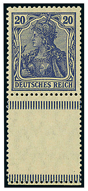| Zusatzinformationen und Suchstichworte: | Dr. Derichs 7. Online Live Auktion 27. - 28. Dezember 2022 Los 2568 Deutsches Reich, Germania mit WZ 20 Pfg. dunkelviolettblau, Kriegsdruck, unten anhängendes Leerfeld, postfrisch in Luxus-Qualität. Von dieser im Michel-Katalog verzeichneten Abart sind nur ganz wenige Exemplare bekannt, die praktisch nie angeboten werden. Neues Fotoattest Jäschke-Lantelme BPP: "in fehlerfreier, postfrischer Erhaltung... Marken mit Leerfeld bei den Germania-Ausgaben sind selten.". (Michel 1.500.-+, unseres Erachtens wird dieser Preisansatz der Seltenheit nicht gerecht.) Ausruf 450,00 EUR |