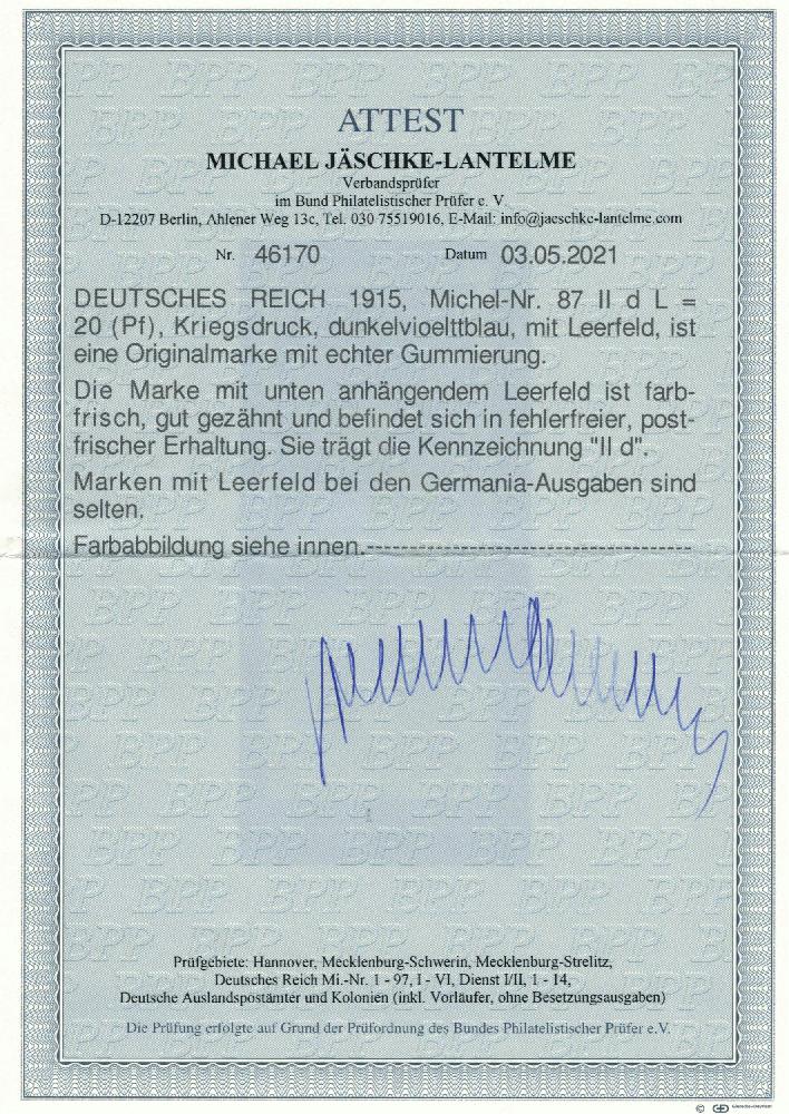 | Prüfer: | Jäschke-Lantelme, Michael (BPP (Bund Philatelistischer Prüfer)) |