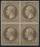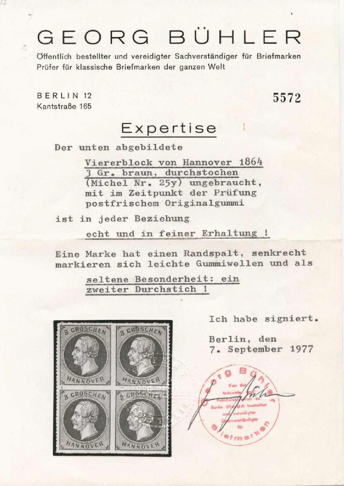 | Zusatzinformationen und Suchstichworte: | 10. Tiergarten Briefmarken und Münzen Auktion 16. Dezember 2022 Los 96 Altdeutschland Hannover 3 Gr. braun durchstochen, postfrischer Viererblock, linke Marken mit zweitem senkrechten Durchstich, ein Wert Randspalt, Foto-Expertise Bühler Ausruf 100,00 EUR |