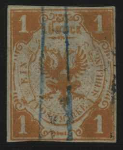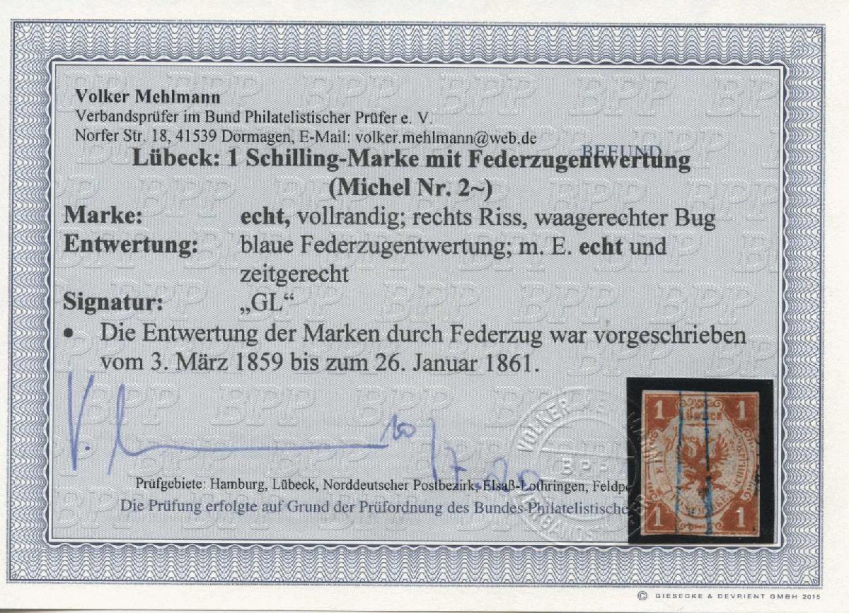 | Zusatzinformationen und Suchstichworte: | 10. Tiergarten Briefmarken und Münzen Auktion 16. Dezember 2022 Los 101 Altdeutschland Lübeck 1 Schilling schwärzlichorange, blaue Federzugentwertung echt und zeitgerecht, Marke vollrandig, rechts Riß und waagerechter Bug, Signatur, Fotobefund Mehlmann BPP Ausruf 100,00 EUR |