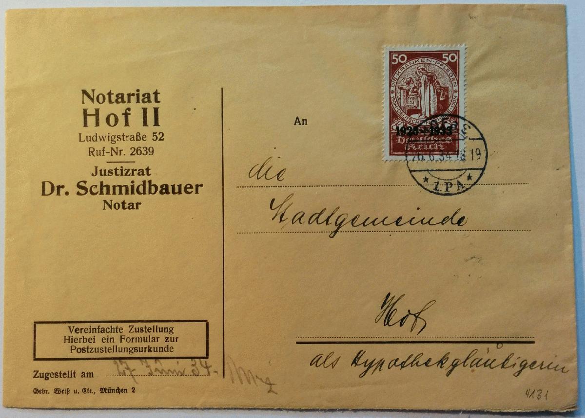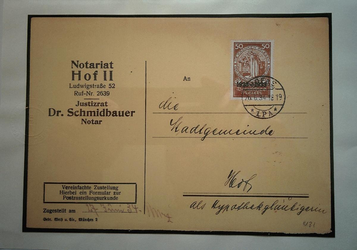 | Zusatzinformationen und Suchstichworte: | Gestempelt, Ortsbrief, Zustellungsurkunde, überfrankiert |