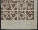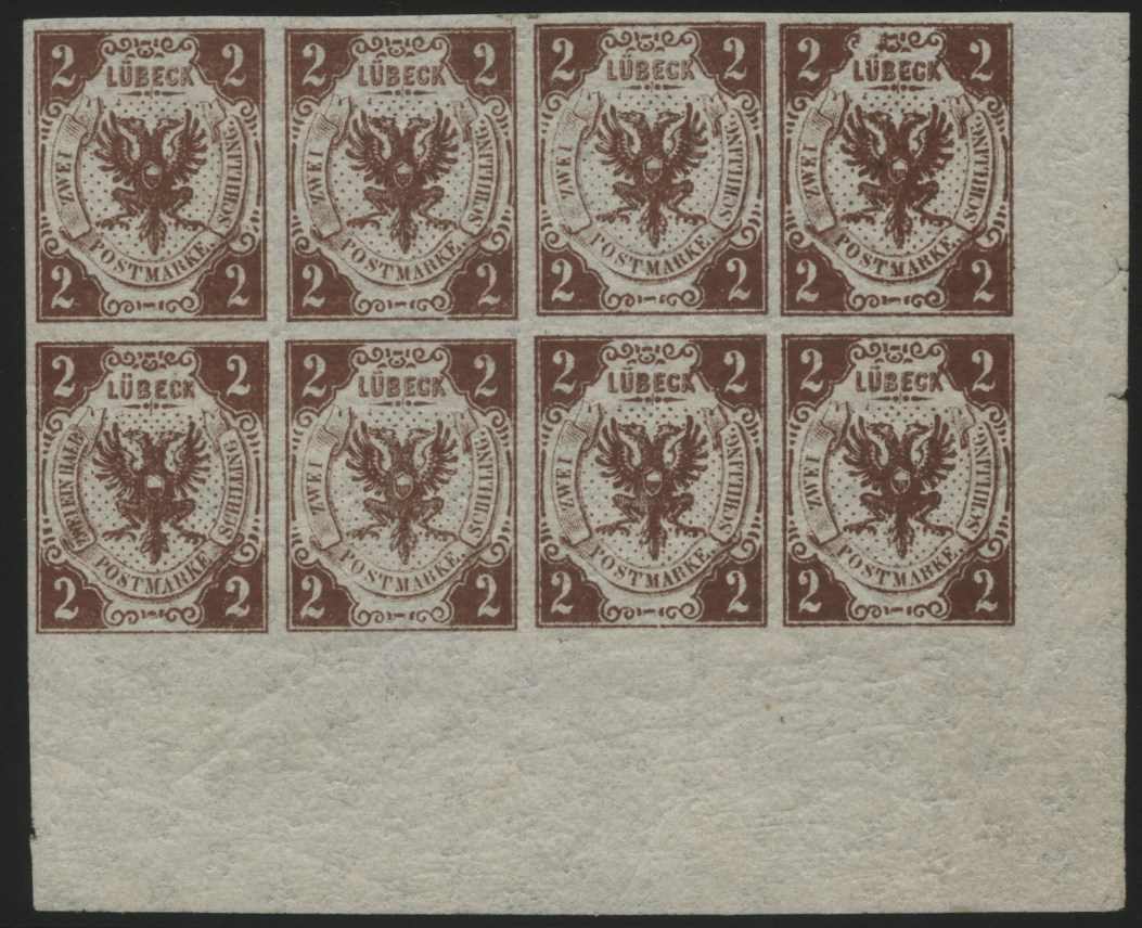 | Zusatzinformationen und Suchstichworte: | 10. Tiergarten Briefmarken und Münzen Auktion 16. Dezember 2022 Los 102 Altdeutschland Lübeck 2 Schilling mit Fehldruck " ZWEI EIN HALB " innerhalb eines ungebrauchten Eckrand - Achterblocks mit breitem Unterrand, sowie rechts mit Rand, farbfrisch, allseits vollrandig und ohne Mängel. Die Gummierung ist nicht sicher prüfbar. Eine seltene Einheit in guter Qualität, Fotoattest Mehlmann BPP Ausruf 400,00 EUR |