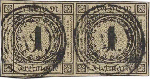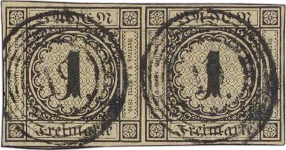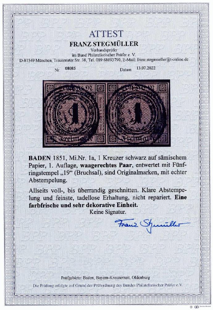 | Zusatzinformationen und Suchstichworte: | 230. Karl Pfankuch & Co Auktion 7. Dezember 2022 Los 3 Altdeutschland Baden 1 Kreuzer schwarz auf sämisch, 1. Auflage, waagerechtes Paar, allseits voll- bis überrandig geschnitten, klare Abstempelung mit zweimal x NS "19" (Bruchsal"), aktuelles Fotoattest Stegmüller, tadellose Erhaltung, nicht repariert. Eine farbfrische und sehr dekorative Einheit. M€ 2.500.-+ Zuschlag 750,00 EUR |