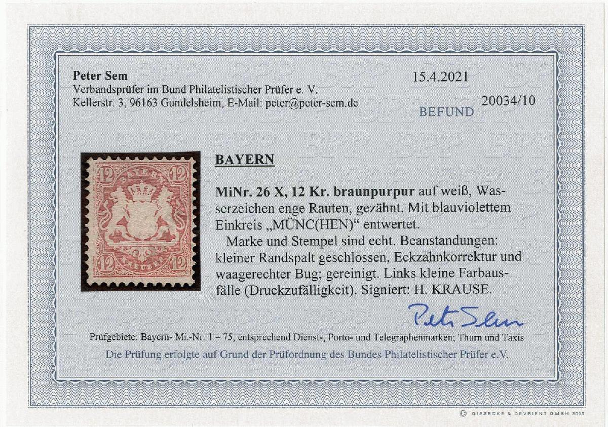 | Zusatzinformationen und Suchstichworte: | 230. Karl Pfankuch & Co Auktion 7. Dezember 2022 Los 110 Altdeutschland Bayern 12 Kr braunpurpur auf weiß enge Rauten, sauber mit blauviolettem K1 "MÜNCHEN", Fotobefund Sem, ein ansprechendes Exemplar dieser seltenem Marke mit kl. Korrekturen. M€ 1.400.- Ausruf 180,00 EUR |